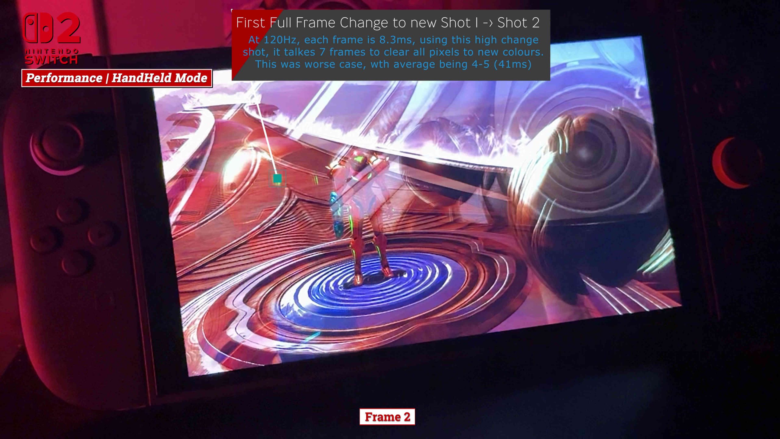 And the same is true of the 120Hz performance mode where try as I might I could only find a single frame drop in combat, motorbiking and puzzle solving even the real time cutscenes present no issues, and this is again true, based on limited tests in the handheld mode. However, this brings us to the LCD elephant in the room and response times of the Switch LCD screen, in my tests using Metroid’s 120Hz mode I found that response times (the time it takes for the pixels on screen to fully transition from on or off, Red to Blue etc) is on average around 41ms which is not good for a screen designed for HDR and 120Hz outputs. As you can see here in my 120 and 240fps capture we can see excessive ghosting of the image which causing blurring in motion but also frame persistent on high contract changes as a sudden shift can take 4-6 frames at 120Hz to full transition. And in action and constant motion, the result is an image that can look blurry and nosier than the same output does on a docked 4K 120Hz screen, such as my OLED LG or Samsung 4K panels. Compounding this is the panel also lacks the brightness and pixel isolation to present anything close to the HDR the game can deliver whilst docked (specifically since Nintendo update the OS HDR config tool to be, well correct now) and this is only compounded by the ghosting persistence issues just noted.  That said, the 120Hz mode is noticeably better in HH mode that the 60Hz one and the drop to 720 makes little difference and thus is my preferred way to play on the move and whilst docked. The significant pixel increase in Quality mode is not as impactful as the increased refresh and input latency, with the OG Switch matching the Switch 2 identically for a 100.17ms input median latency in the single and Quality 60hz mode respectively. Whereas the 120hz increases this by over 41% to 58.5ms Median, which feels significantly better. And this carries over to docked mode also, but your screen of choice will have an impact on that.